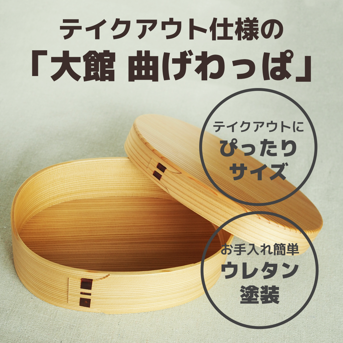 伝統工芸「大館曲げわっぱ」を、テイクアウト仕様にアップデートした弁当箱です。